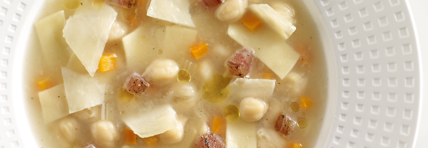 1. Versare il brodo fatto con Vegetalbrodo Bauer in una casseruola, inserirvi ceci, sedano, cipolla, carota, aglio e portare a cottura.
